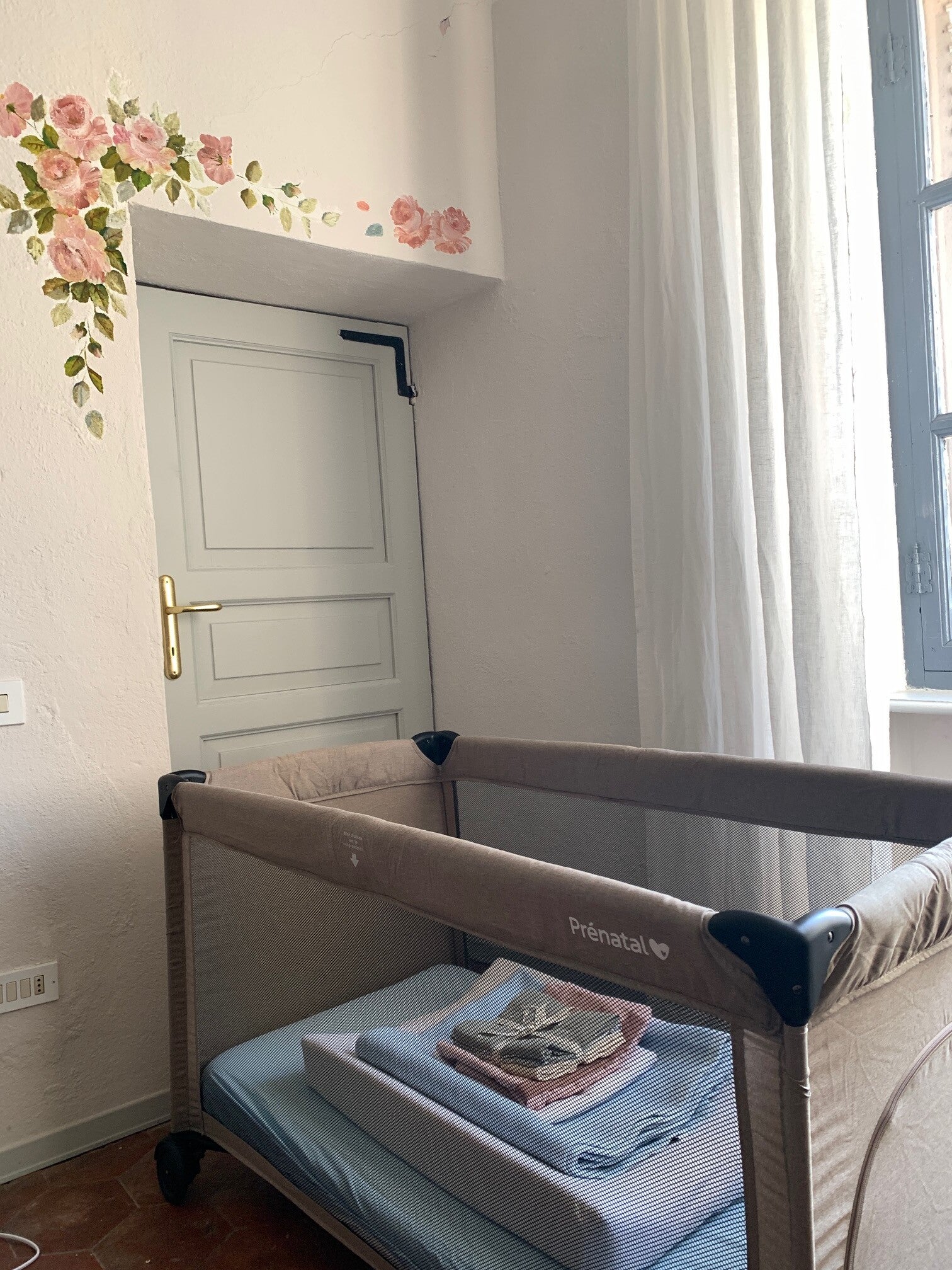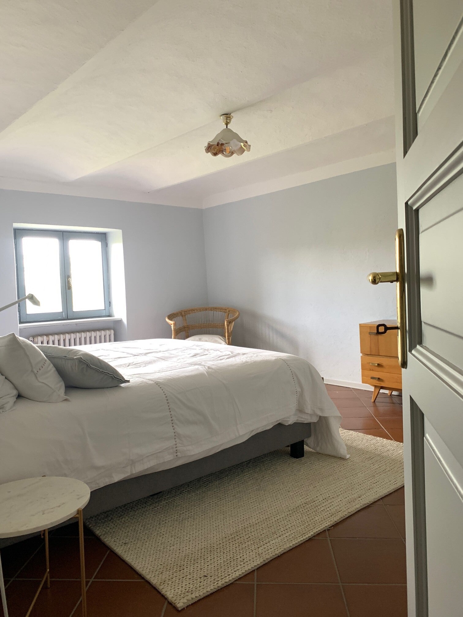 De gele kamer: gezellige kamer met een grote tweepersoonsboxspring (1.80), nachtkastjes, kledingrek, dressoir, stoel. Uitzicht op de heuvels.